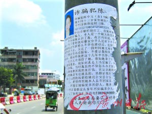 中山雅商律師事務(wù)所的律師封謨喜對(duì)記者表示,“公開(kāi)把別人的身份資料貼在公共場(chǎng)合,這是違法的行為。輕則違反《治安管理處罰條例》,重則構(gòu)成了犯罪。如果貼了幾十張,這種行為其實(shí)算是比較嚴(yán)重了!贝送,封律師對(duì)記者表示,未經(jīng)審判,直接稱(chēng)他人為“詐騙犯”,這也是侵害名譽(yù)權(quán)的行為。封律師表示,若認(rèn)定被詐騙可向公安部門(mén)報(bào)案(記者張堅(jiān)攝影報(bào)道)