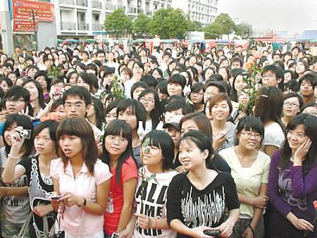 昨天下午,這個特殊的慶生派對在寧波一所高校北區(qū)宿舍商業(yè)區(qū)的中心廣場上舉行。下午4點,光鮮的舞臺早已搭好,舞臺上拉著巨幅的噴繪背景,還有樂隊演奏著歡快的樂曲。
