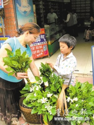 5月19日上午9點,空中飄著零星小雨。沙坪壩區(qū)小龍坎新村路入口處,裝滿梔子花的背簍立在人行道上,旁邊蹲著一個短頭發(fā)、斜背小包的小女孩。有人走近,她立刻放聲大喊:“梔子花,新鮮芳香的梔子花。
