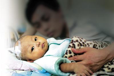 昨日,兒童醫(yī)院內(nèi)科住院部,5個(gè)月大的周舟躺在父親周林的臂彎里記者 孫須 攝