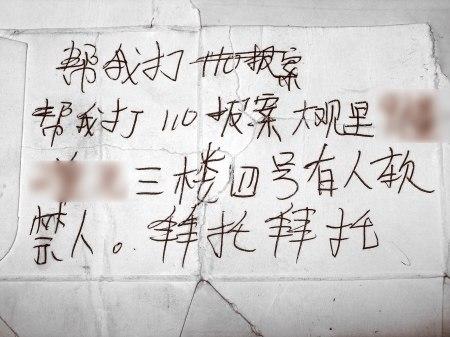 “幫我打110報案……有人軟禁人,拜托拜托!弊蛉障挛2點,家住成都大觀里某小區(qū)的一位大爺正在小區(qū)內(nèi)散步,突然,一張硬紙條歪歪扭扭地從三樓窗戶飄落下來,大爺拾起一看,大吃一驚,立即將紙條交給小區(qū)門衛(wèi)。5名警察接警后立即出動……