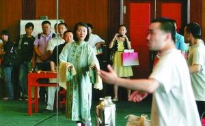 昨日,國家京劇院的排練館里,6名演員在參觀者面前認真對戲。隔壁,一名女演員“表演”著化妝、穿戴,準備唱一出“天女散花”,這些幕后工作平時并不對外開放。