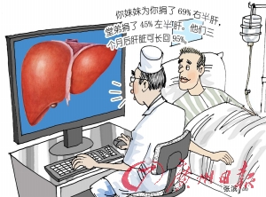 “患者親妹妹為他捐了69%右肝、堂弟捐了45%左肝,供受三方均穩(wěn)定平安,兩位供體三個月后肝臟可再生回95%,完全可以恢復(fù)正常的工作、生活!敝猩揭辉焊痹洪L何曉順教授告訴記者,一切數(shù)據(jù)都是經(jīng)過嚴(yán)格精細(xì)計算,“切多了供體會出現(xiàn)肝衰,切少了受體不夠用!彼硎。