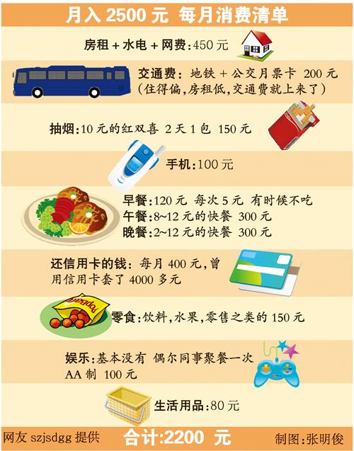 近日,一名剛剛踏入職場的年輕白領(lǐng)szjsdgg在大洋網(wǎng)上稱自己“月薪2500元在廣州的生活”:大學(xué)畢業(yè)1年半,工作1年多,現(xiàn)在在廣州拿著2500元左右的月薪,剛夠基本生活開銷,只剩下300元。