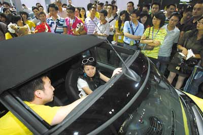 昨日下午3:30左右,寶馬展廳里那輛惹眼的黃色i Cooper前早已人頭攢動,上百市民駐足此地觀看名車。
