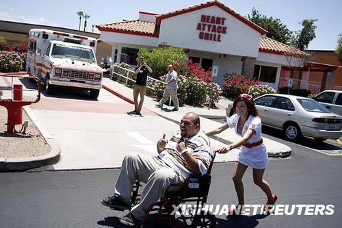 6月17日,在美國亞利桑那州錢德勒的“心臟病燒烤”餐廳,食客們身穿病人服享受美食。新華社/路透
