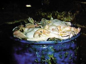 日前,南海當(dāng)?shù)卣鶕?jù)記者提供的線索,執(zhí)法搗毀了多個(gè)死鵝、死鴨加工點(diǎn)。在記者暗訪過的一個(gè)位于荒地和臭水溝旁的窩點(diǎn),執(zhí)法部門發(fā)現(xiàn)了堆放在桶里和冰柜里的上百只死家禽,有的已腐爛發(fā)臭。用來給死家禽脫毛的瀝青不知反復(fù)使用了多久,臭味很重。據(jù)查,每天僅這個(gè)作坊加工、販賣的問題家禽就有四五百只。