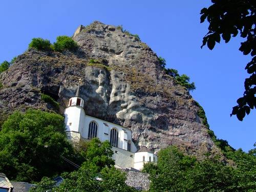 巖石教堂位于德國(guó)風(fēng)景優(yōu)美的伊達(dá)爾—奧伯施泰因小鎮(zhèn)旁。這里是德國(guó)著名的寶石之鄉(xiāng)。走在小鎮(zhèn)的石板路上,記者老遠(yuǎn)就看到鎮(zhèn)外山上巖石峭壁上的白色小教堂。