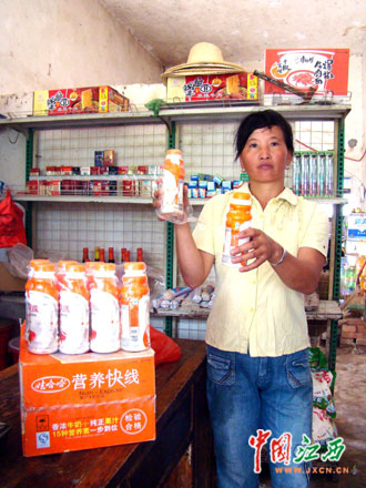 當(dāng)日上午,記者驅(qū)車來(lái)到墩上村實(shí)地采訪。今年41歲的鄒根枝兒女都在外務(wù)工,和丈夫鄒新海兩人在家?guī)腿搜b殼子板,每天120多元的收入讓兩人很是滿足,平時(shí)除了吃飯外還特意買(mǎi)些原料補(bǔ)充營(yíng)養(yǎng)。鄒根枝介紹說(shuō):“6月20日,我從墩上村鄒德水的便利店里買(mǎi)來(lái)一箱娃哈哈營(yíng)養(yǎng)快線,當(dāng)時(shí)怕飲料不新鮮,還特意看了生產(chǎn)日期,見(jiàn)是2009年5月31日生產(chǎn)的才放心買(mǎi)了回去,放在家里晚上看電視的時(shí)候喝,有些時(shí)候我老公(鄒新海)也喝一瓶,但沒(méi)有我喝得多。幾天后,我感覺(jué)肚子不舒服,上吐下瀉,為此專程搭車到萬(wàn)年縣石鎮(zhèn)街去買(mǎi)胃藥,花了差不多200元錢(qián)病情卻不見(jiàn)好轉(zhuǎn),而且肚子痛得特別厲害。沒(méi)有辦法,我只好到屋前的墩上衛(wèi)生所去看病,打了幾天吊針以后病情才有所好轉(zhuǎn)。這次看病不僅花費(fèi)了近400元醫(yī)藥費(fèi),還耽誤了一個(gè)多星期沒(méi)有干活,就連前兩天插秧都是請(qǐng)人干得,我的損失可大了!