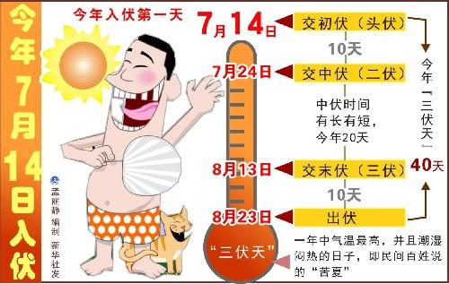 頭伏餃子二伏面,三伏烙餅攤雞蛋。明天是今年的入伏日。市氣象專家介紹,今年入伏日在7月14日,“頭伏”長10天;7月24日入“中伏”,二伏有20天;8月13日入“末伏”,三伏有10天,整個“三伏天”達40天。