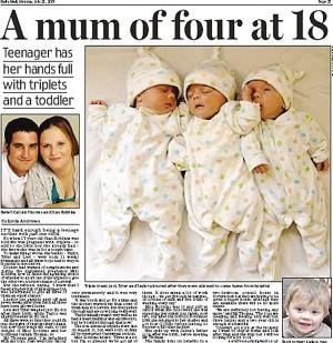 目前,斯安和2歲的兒子加登住在一套政府提供的廉租公寓中,完全靠政府救濟生活,她每月能領到1126英鎊救濟金,其中包括房租、兒童福利和家庭稅收貸款。盡管如此,斯安母子二人的生活仍十分拮據(jù)。去年,斯安又結識了19歲的新男友卡魯姆·托馬斯,盡管斯安和卡魯姆都沒想過要生孩子,但去年10月,當時只有17歲的斯安卻再次意外懷上了身孕。更讓斯安做夢也沒想到的是,她懷上的竟是一組三胞胎!