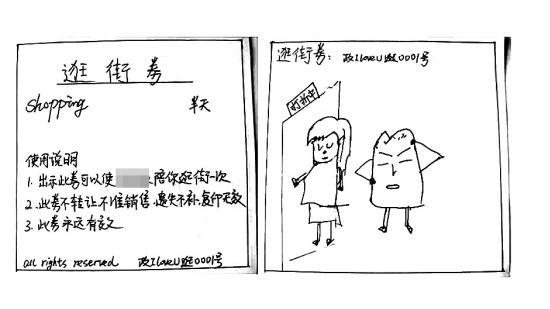 “逛街券”:只能使用半天,出示此券,不愛(ài)逛街的小王必須乖乖就范,陪小李逛街。