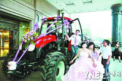 29日下午,由18輛拖拉機(jī)和多輛寶馬、奔馳等組成的浩浩蕩蕩的迎親車隊(duì),由廣東湛江市麻章區(qū)出發(fā)開往婚禮舉辦場(chǎng)所——湛江市“皇冠假日酒店”,沿途引來(lái)了大批市民駐足。