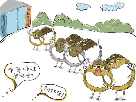 今天是2009年9月9日,成為眾多年輕人喜定終身大事的好日子。不少年輕男女選在今天去登記結(jié)婚,有的選在今天大擺喜宴……他們看中的是這個(gè)日子里蘊(yùn)含的百年一遇的“久久久”好彩頭。民俗專(zhuān)家解釋說(shuō),2009年9月9日,因諧音讀起來(lái)像“愛(ài)你久久久”,吸引了許多年輕人選擇在今天喜結(jié)良緣,祈求婚姻長(zhǎng)久。這一現(xiàn)象源于古人對(duì)數(shù)字的崇拜,現(xiàn)在人們利用漢字之間的諧音,以祈福表達(dá)良好祝福。