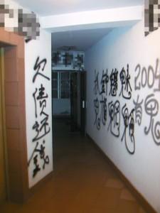 昨晚,記者在該樓20層看到,雪白的墻面上幾乎被黑漆涂滿了字。居民走出電梯或家門,映入眼簾的便是“殺”、“死”、“此屋有鬼”、“欠債還錢”之類的大字。2004室的鐵皮防盜門已被砸得嚴重變形,門鎖上方有一個碗大的窟窿。透過窟窿,記者發(fā)現里面似乎已多時沒有人住了。