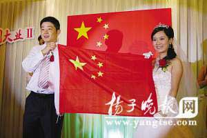 新娘柳燕告訴記者:“我們前陣子一同去北京看升旗儀式和閱兵式排練,現(xiàn)場(chǎng)那種莊嚴(yán)和隆重的氣氛嚴(yán)重感染了我們,當(dāng)時(shí)突然有了靈感。今年是新中國(guó)成立六十周年紀(jì)念,又是我們小家正式成立之時(shí),有大國(guó)才有小家,為什么不做一個(gè)國(guó)慶為主題的婚禮呢?”