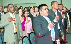 ▲美國一個州的新移民正在舉行宣誓入籍儀式。