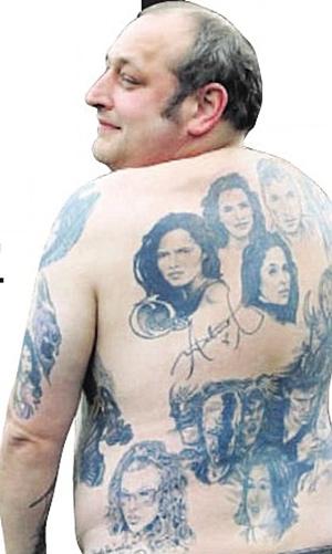 據(jù)英國(guó)媒體9日?qǐng)?bào)道,英國(guó)41歲男子斯蒂夫·波特(右圖)堪稱是一名“超級(jí)追星族”,在過(guò)去10來(lái)年中,他將自己最喜愛(ài)的24名歐美影星和搖滾歌星的頭像都文在了自己的前胸、后背、臂膀以及大腿上。其中的12個(gè)明星還在波特的身體皮膚上留下了各自的親筆簽名。每當(dāng)一個(gè)明星用筆在波特的皮膚上簽名后,波特就會(huì)立即趕往一個(gè)文身藝術(shù)家的工作室中,請(qǐng)文身藝術(shù)家將他最新得到的名人簽名也永久性地文在他的皮膚上。據(jù)悉,波特目前計(jì)劃申請(qǐng)吉尼斯世界紀(jì)錄。