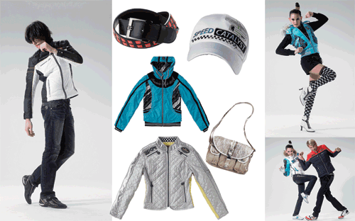 配合著這樣的理念,印滿字母的T恤街頭感十足,一副酷酷的壞壞的樣子讓男生的吸引力上升。外面搭配白色的茄克更顯帥氣清爽,一條做舊的牛仔褲復(fù)古感覺強烈,黑白為主色的運動鞋與整體的色系相統(tǒng)一。而女裝有以純黑基本色為主色調(diào),羅紋與真皮相結(jié)合,加以局部白色設(shè)計點綴,整體服裝風(fēng)格給人以簡潔干練的感覺。胸前的立體紋案設(shè)計,將賽車與休閑完美地結(jié)合在一起。白色弧形剪裁分割線,既完美勾勒出女性的優(yōu)美曲線,又凸顯女性自信獨立的氣質(zhì)。