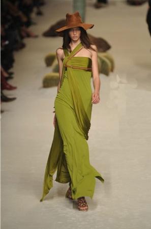 Hermes以面料的質(zhì)感和些微色度的差別豐富了視覺的層次,特別的是胸前扣搭的斜肩皮帶,加上牛仔帽的點(diǎn)綴,不難看出設(shè)計(jì)師對(duì)西部靈感的堅(jiān)持。