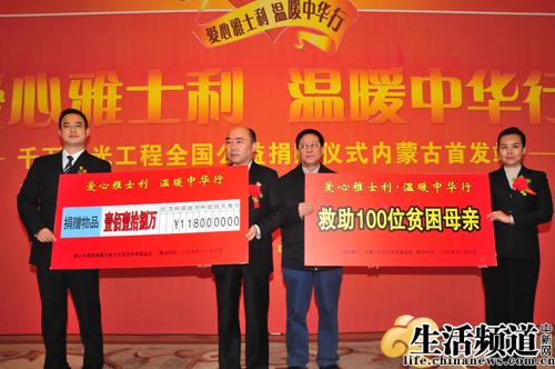 江南綠樹成蔭,塞北已然雪舞。一場(chǎng)面向全國范圍內(nèi)的“愛心雅士利,溫暖中華行” 千萬陽光工程全國公益捐贈(zèng)系列活動(dòng)11月10日上午首站內(nèi)蒙古。在呼和浩特市當(dāng)天舉辦的捐助發(fā)放儀式上,國內(nèi)知名奶粉企業(yè)雅士利集團(tuán)攜手中華慈善國際互聯(lián)網(wǎng)救助中心、內(nèi)蒙古扶貧基金會(huì),將捐贈(zèng)物資發(fā)放到亟需幫助的兒童福利院與貧困小學(xué)。內(nèi)蒙古自治區(qū)扶貧辦黨組成員副主任馮有恩、黨組成員副主任杜古、黨組成員紀(jì)檢組長甄小兵及內(nèi)蒙古扶貧辦機(jī)關(guān)各處室及事業(yè)單位的主要領(lǐng)導(dǎo)出席了活動(dòng)。來自新華社內(nèi)蒙古分社、內(nèi)蒙古電視臺(tái)、呼和浩特電視臺(tái)、呼和浩特電臺(tái)、《內(nèi)蒙古日?qǐng)?bào)》、《內(nèi)蒙古晨報(bào)》、《北方新報(bào)》、《北方家庭報(bào)》、《呼和浩特日?qǐng)?bào)》、《乳業(yè)時(shí)報(bào)》、《香港商報(bào)》和《法制與社會(huì)雜志》等媒體記者共同見證捐助發(fā)放儀式。