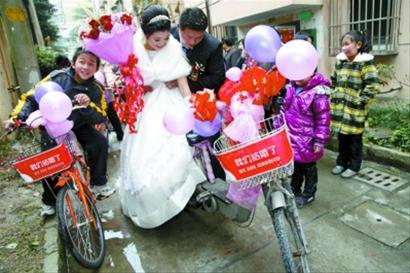“四輪車人人結(jié)婚都會乘,兩個輪子的就少見了吧。 ”新郎孫軍說,現(xiàn)在政府提倡節(jié)能以保護(hù)環(huán)境,用租賃自行車迎親,既響應(yīng)了政府號召,又降低了婚禮成本。并且這種形式與眾不同,非常有紀(jì)念意義。新郎新娘都姓孫,在同一家房地產(chǎn)公司工作,在商量婚事時,新娘希望能用一種別樣的方式來紀(jì)念他們的特殊緣分,于是這個自行車迎親方案立即得到了大家的青睞,“很特別,能讓人記一輩子”,新娘笑著說。
