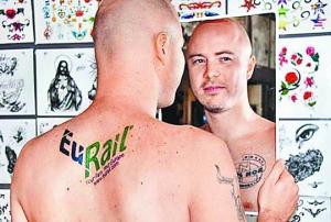 信息時報綜合報道 據(jù)英國媒體3日報道,澳大利亞一名失業(yè)漢知道雙親渴望到歐洲旅行后,為讓他們今年有個難忘的結(jié)婚周年紀念,毅然向歐洲鐵路公司提出建議,他把該公司的標志賣廣告文在身上,換取兩張免費歐洲游車票,沒想到最后竟得償所愿。