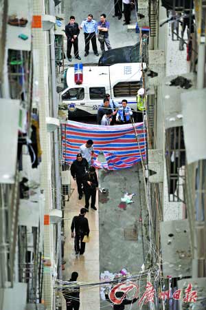 昨天上午11時(shí),記者接到報(bào)料后趕往寶安區(qū)民治街道民樂(lè)新村。在事發(fā)現(xiàn)場(chǎng),警方已經(jīng)將133棟樓和134棟樓用警戒線包圍起來(lái)。133棟樓共6層,134棟樓共13層,跳樓的女子就摔在兩樓之間2米多寬的小巷里。