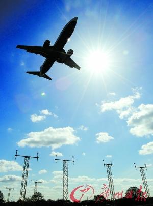21日,一架飛機(jī)在倫敦希斯羅機(jī)場上空飛行。