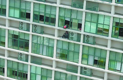 昨天,在寧波老年大學(xué)7樓外墻上,一名男子蹲坐在大約50厘米寬的外墻水泥臺(tái)上,激動(dòng)地打著電話。
