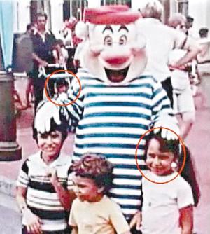 唐娜(前方圈內(nèi))5歲時在迪斯尼樂園拍攝的照片,她的“未來丈夫”亞歷克斯(后方圈內(nèi))坐在折疊式童車里。