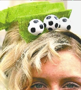 —名女模特在展示由“綠茵場(chǎng)”和“足球”組合成的頭飾(如右圖)。是不是很有創(chuàng)意?