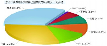 據(jù)相關(guān)報道,2009年中國托福考生人數(shù)較前年大幅增加30%,成為迄今參加托?荚嚨闹袊忌藬(shù)最多的一年。而隨著世界名校認(rèn)可度的提升,雅思的市場份額也日益加大。啟德教育官方網(wǎng)在4月至6月間展開了“2010年中國首次中學(xué)生留學(xué)意向調(diào)查”,在本次調(diào)查中,選擇雅思和托?荚嚺嘤(xùn)班的基本持平,分別占32.1%和31.2%。數(shù)據(jù)統(tǒng)計結(jié)果如右圖: