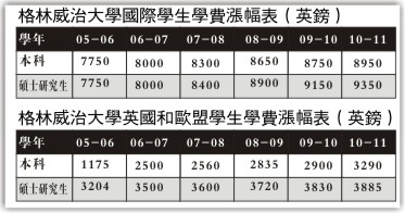 位于倫敦東南的格林威治大學(xué)是一所擁有較多中國留學(xué)生的學(xué)校,過去8年每年大陸留學(xué)生都在千人以上。該校收費(fèi)歷來屬于中等偏下,2009年國際學(xué)生的學(xué)費(fèi)是本科每年8750鎊,而研究生則是9150鎊。今年9月起新學(xué)年的費(fèi)用略有調(diào)整,本科要8950鎊,碩士研究生需要9350鎊,只比前一年增加200鎊。