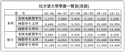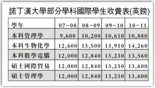 諾丁漢大學(xué)位于英國中部。由于近幾年與中國多所院校合作辦學(xué),中國留學(xué)生成批涌進(jìn)這所大學(xué);同時該校還在浙江寧波設(shè)立分校,有條件的大三學(xué)生會到英國讀書一年。記者聯(lián)系到該校的碩士研究生陳兵同學(xué),他詳細(xì)列出該校歷年來的收費(fèi)標(biāo)準(zhǔn)。今年的學(xué)費(fèi)比去年略有上漲,但增長率與往年持平。他覺得這個上調(diào)的價格是合理的,中國來的同學(xué)都能接受。