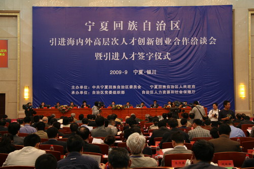 2009寧夏引進(jìn)海內(nèi)外高層次人才創(chuàng)新創(chuàng)業(yè)合作洽談會9月7日下午在自治區(qū)首府銀川召開。此次洽談會聘27名院士、17名專家為“自治區(qū)特聘顧問”,宣布建立8家院士工作站和11家專家服務(wù)基地。自治區(qū)政府和一些單位與柔性和全職引進(jìn)的專門人才簽署了相關(guān)框架協(xié)議、共建協(xié)議和聘用合同等。
