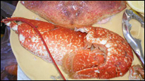 我們接受了店長的建議,從鎮(zhèn)上的小店買來面包和飲料回來,待我們歸來,位子也正好等到了,拼桌!看著菜單上豐富誘人的海鮮,我早已等不及了, 點(diǎn)了這里的招牌菜:兩人份海鮮拼盤(9.5磅每人),其中包括, 美味大蟹,深黃粉紅對蝦, 多汁鳥蛤(海扇),腌熏三文魚,對蝦,鯡魚,煙熏馬加魚,蚌和綠蚌貝,另外我們還點(diǎn)了大龍蝦,奶油蒸歐洲蠔(只有9月和4月之間可以吃到)和蔬菜沙拉。品嘗海鮮最好配以檸檬,芥末,醋,壽司醬油,和辣椒醬。 店內(nèi)提供檸檬,塔巴斯哥辣醬油和醋,如果你還想要什么配料,可以在小鎮(zhèn)的店上找到。