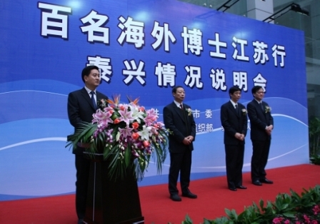14日,江蘇省泰興市又一次迎來了“百名海外博士江蘇行”活動的海外博士們。中共泰興市委、市政府對遠道而來的海外博士們表示熱烈歡迎和誠摯的感謝。江蘇省人力資源和社會保障廳副廳長陳勵陽,中共泰興市委書記、市人大常委會主任張兆江,中共泰興市委副書記、市長高亞梓等領導出席了此次泰興說明會和項目洽談會。