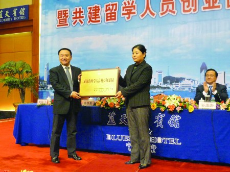19日,山東省留學人員創(chuàng)業(yè)園建設現(xiàn)場會暨共建留學人員創(chuàng)業(yè)園授牌儀式在威海藍天賓館舉行。會上,山東省人力資源和社會保障廳向威海、濰坊和臨沂三市授予了共建留學人員創(chuàng)業(yè)園牌匾。據(jù)了解,“威海海外學人高科技創(chuàng)新園”由威海與32個留學人員團體共同創(chuàng)建,留學人員已創(chuàng)辦企業(yè)38家。(圖為省人力資源和社會保障廳廳長董國勛向威海頒發(fā)共建牌匾)。(劉潔)