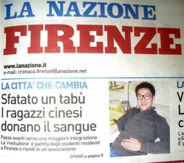 意大利主流媒體民族報(LA NAZIONE)在中國留學生無償獻血后,在頭版顯要位置率先發(fā)表意大利媒體界資深著名評論員喬瓦尼-斯帕諾的文章,文章以“一項禁忌被打破,中國人開始獻血,”來稱頌中國留學生為意大利社會所做出的貢獻,稱贊中國留學生為華人社會帶了一個好頭。喬瓦尼在文章中說,本次中國留學生的獻血活動,象征著華人向融入意大利主流社會邁進了一大步,并且是特別有意義的一大步。