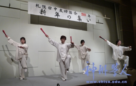 宴會中舉辦方為大家精心準(zhǔn)備的日本舞蹈——千葉玉枝博得了來賓們的陣陣掌聲與由衷贊賞。札幌太極拳協(xié)會隨后的太極梅花扇表演更是把整個宴會推向了一個高潮。來自中國的各界朋友對日本友人的認(rèn)真表演和對中國文化的宣揚(yáng)表示了由衷的贊賞與謝意。