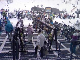 休息大廳前,大家都把滑雪器材放在這里,然后去休息。最近時(shí)興滑板子,所以放眼望上去都是各色滑雪板。