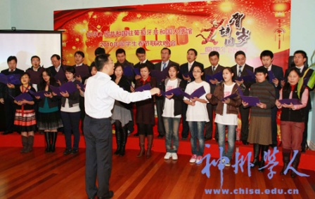 隨后,聯(lián)歡晚會(huì)在《我和我的祖國(guó)》的歌聲中拉開了序幕。留學(xué)生們和使館工作人員獻(xiàn)上了形式多樣的節(jié)目:舞蹈《蒙古舞》、《金梭和銀梭》,小品《吃面》、《賣拐》,男聲獨(dú)唱《故鄉(xiāng)的云》,女聲獨(dú)唱《父老鄉(xiāng)親》,配樂詩(shī)朗誦《致橡樹》等等。精彩紛呈的表演時(shí)時(shí)引來熱烈的掌聲和喝彩聲,會(huì)場(chǎng)上始終洋溢著歡樂祥和的節(jié)日氣氛。