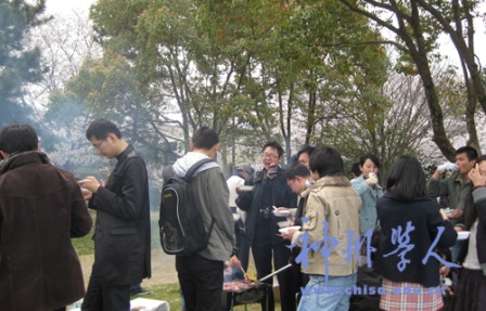 正午時(shí)分,同學(xué)們又回到賞花的大本營-----大濠公園櫻花樹下!皟(yōu)しい”的學(xué)友會(huì)負(fù)責(zé)人員已經(jīng)為大家準(zhǔn)備好了烤肉用的器具以及各種飲料。大家自覺地分成三、五人一組,圍著燒烤架邊聊天邊開始品嘗自己動(dòng)手制作的美食。