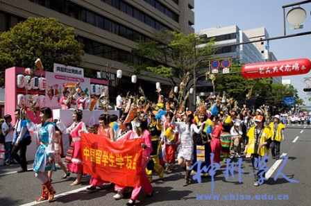 作為最能代表福岡博多的節(jié)日之一,也是西日本最有名的全民歡樂節(jié)之一,“博多打鼓節(jié)”起于平安時代,由一種稱為“松囃子”的民間藝術(shù)演變而來,最早的時候,它是向當?shù)仡I(lǐng)主祝賀新年的儀式,如今已經(jīng)演變成為福岡地區(qū)傳統(tǒng)的節(jié)日,市民組織各式各樣的慶祝活動。2010年度的博多打鼓節(jié),中國留學(xué)生報名踴躍,積極參與,“中國留學(xué)生方隊”列于壓軸位置,在各個留學(xué)生隊伍中,“中國留學(xué)生方隊”參加人數(shù)最多,展示了中國傳統(tǒng)的少數(shù)民族服飾服飾和舞獅表演,亮點頻現(xiàn)。