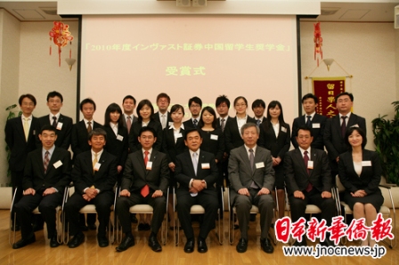 中新網(wǎng)5月18日電 據(jù)日本新華僑報網(wǎng)報道,5月15日,由日本英巴斯特證券株式會社發(fā)起的2010年度“中國留學(xué)生獎學(xué)金”頒獎儀式,在中國駐日本大使館教育處隆重舉行。中國駐日本大使館教育處公使銜參贊孫建明、日本英巴斯特證券株式會社代表取締役社長川路猛出席儀式并向獲獎中國留學(xué)生頒獎。協(xié)助本次獎學(xué)金制度的施和獲獎評選的《日本新華僑報》社社長吳曉樂、全日本中國留學(xué)生學(xué)友會的代表也出席了本次儀式。