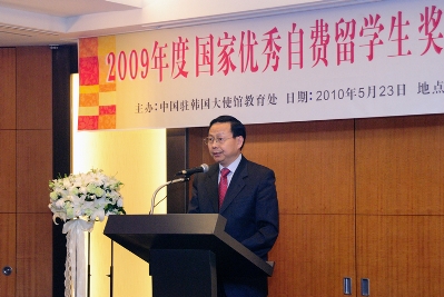 艾宏歌參贊介紹了“國家優(yōu)秀自費(fèi)留學(xué)生獎學(xué)金”設(shè)立的背景和頒獎情況。他說,自2003年實(shí)施以來,總共有1900余名在外優(yōu)秀留學(xué)人員獲獎。2009年度獎勵規(guī)模達(dá)497人,其中在韓自費(fèi)留學(xué)生13人獲獎。他希望同學(xué)們牢記張大使的囑托,奮發(fā)努力,為祖國的建設(shè)和中韓關(guān)系發(fā)展發(fā)揮積極作用。
