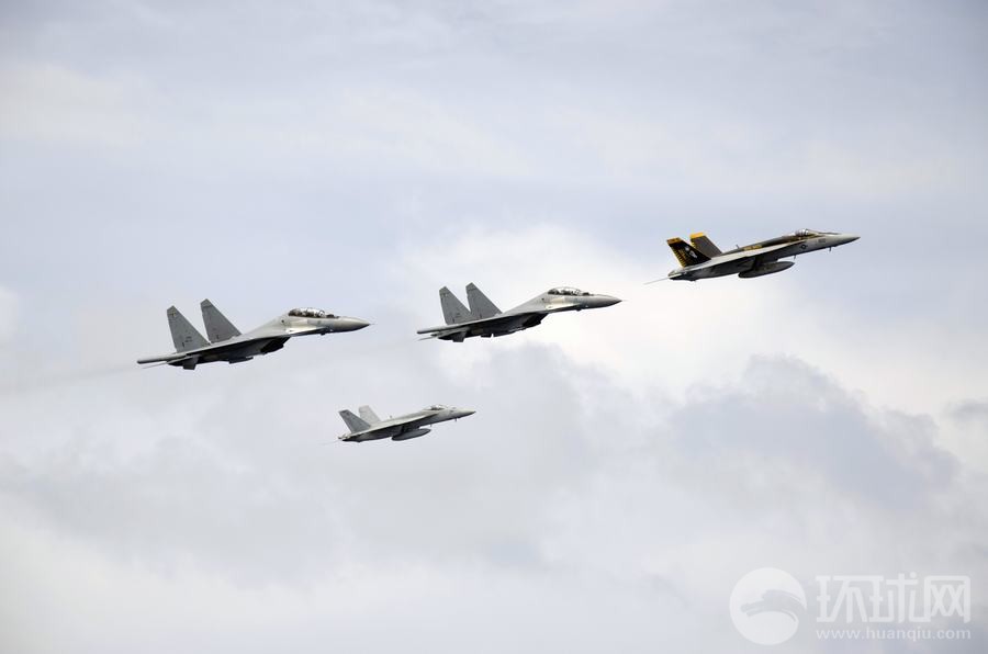 馬來(lái)西亞海軍的蘇-30戰(zhàn)機(jī)與美國(guó)海軍的F/A-18戰(zhàn)斗機(jī)組成編隊(duì)從華盛頓號(hào)航母上空飛過(guò)