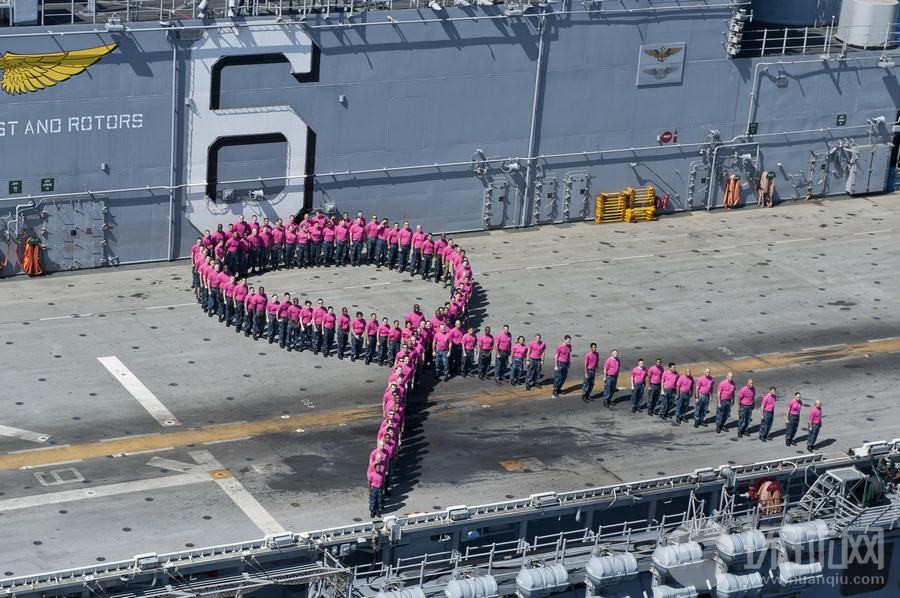 艦員們身著粉紅色衣服在甲板上站成一條絲帶的形狀,一次表示他們對(duì)乳腺癌宣傳周的支持。