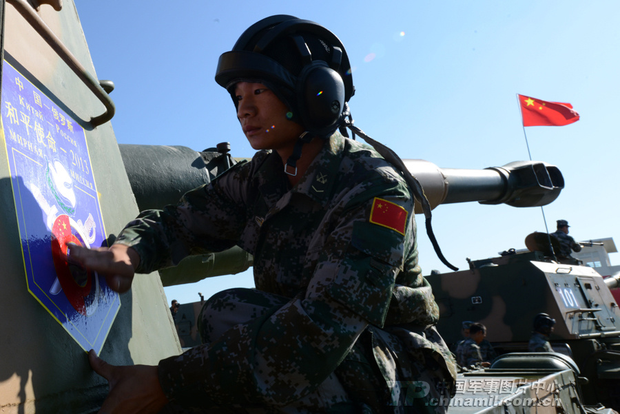 一名戰(zhàn)士給將要出征的戰(zhàn)車(chē)貼上演習(xí)圖標(biāo)